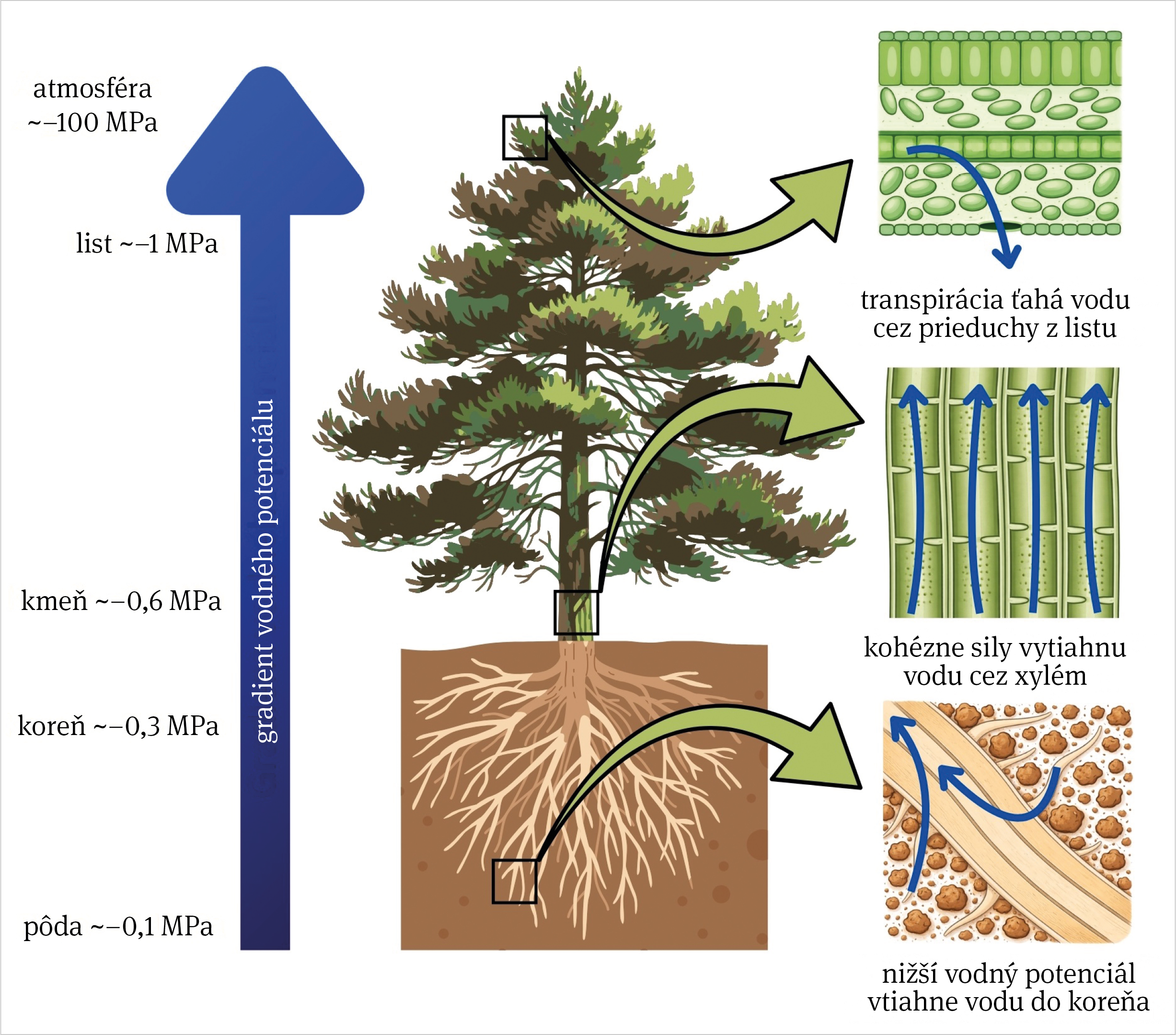 Kľúčom k pochopeniu toho, prečo stromy počas sucha odumierajú, je pojem vodný potenciál. Ide o fyzikálnu veličinu vyjadrujúcu energetický stav vody v rastline. Vodný potenciál sa skladá z osmotickej zložky súvisiacej s koncentráciou rozpustených látok a z tlakovej zložky, ktorá súvisí s mechanickým tlakom alebo napätím vody v pletivách. Napríklad pitná voda v pohári má vodný potenciál blízky 0 megapascalov (MPa), mokrá pôda môže mať vodný potenciál približne −0,1 MPa, korene stromov asi −0,3 MPa a listy počas dňa približne −1 MPa. Atmosféra má pri 25 °C a 50 % vlhkosti vzduchu vodný potenciál približne −94 MPa. Voda sa pohybuje vždy smerom z vyššieho (menej negatívneho) vodného potenciálu do nižšieho (viac negatívneho). Tento gradient umožňuje transport vody z pôdy cez korene, kmeň a konáre až do listov, kde sa voda vyparuje počas transpirácie.