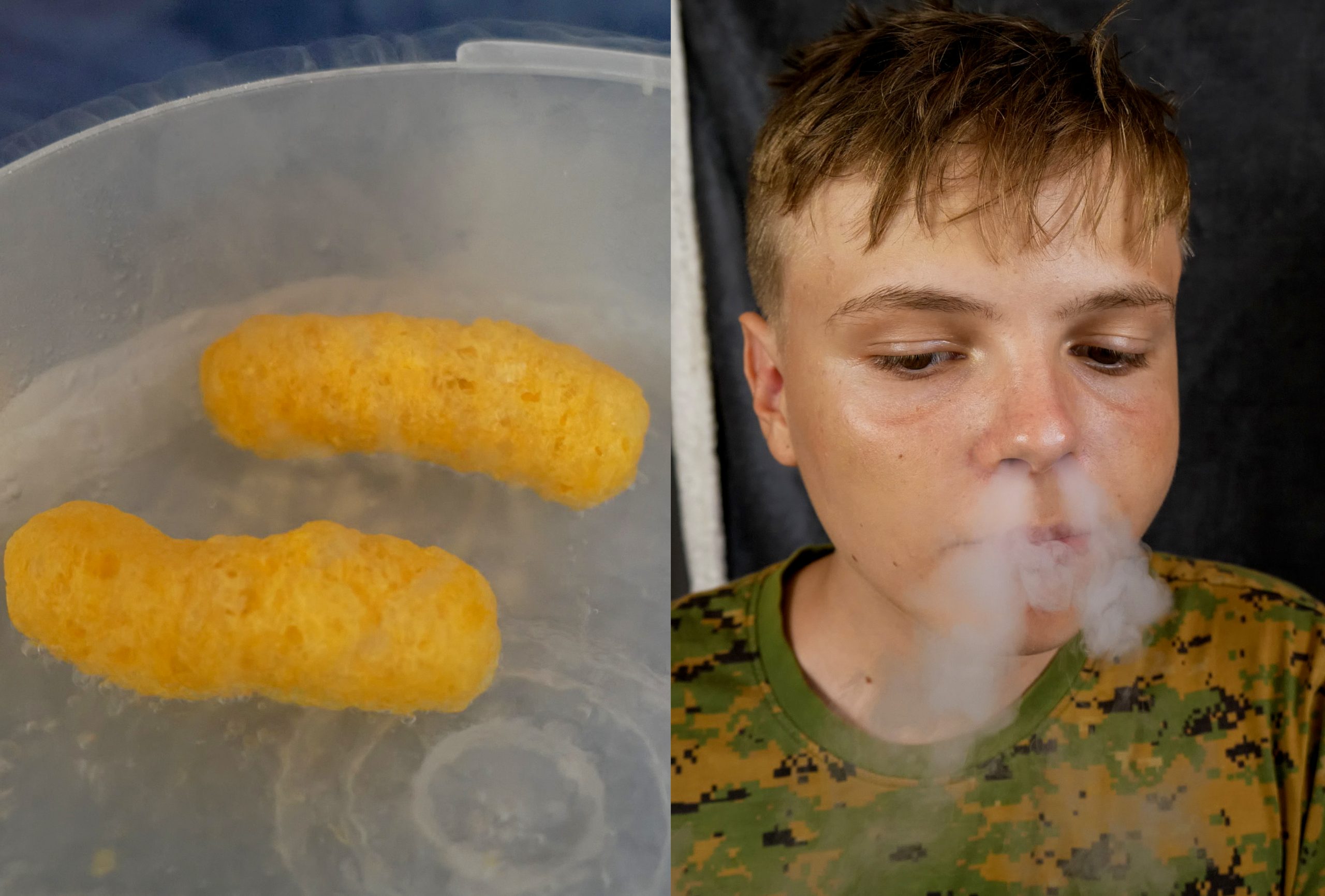 Vysvetlenie: Chrumka sa v dusíku ochladí a zároveň sa do jej vzduchových kapsičiek dostane malé množstvo tekutého dusíka. Ten sa žuvaním uvoľňuje a ochladí pary vnútri ústnej dutiny, takže para skondenzuje. Pri troche cviku ju dokážeme vyfukovať cez nos.