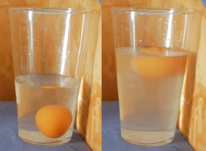 Vysvetlenie: Slaný roztok zvýši hustotu vody v pohári a vajíčko vypláva. Má totiž hustotu len o málo väčšiu, ako je hustota čistej vody. To, či vajíčko dokáže plávať aj v sladkej vode závisí od jeho čerstvosti. Čerstvé vajíčko klesne v sladkej vode na dno a na bok, staršie vajíčko klesne na dno, no postaví sa na špičku a staré vajíčko dokonca pláva.
