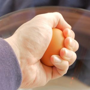 Postup: Surové vajíčko nesmie byť prasknuté ani inak poškodené. Vajíčko dáme do igelitového vrecka. Uchopíme vajíčko do dlane a pokúsime sa ho rozpučiť, pričom sa o to usilujeme dlaňou, a nie prstami.