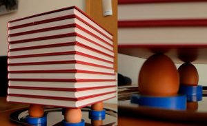 Postup: Umiestnime vajíčka do držiakov – lepiacich pások. Dbajme na to, aby vajíčka boli otočené rovnako, teda aby špicatejší konček smeroval pri všetkých vajíčkach zhodne (ideálne nahor). Potom rozložíme vajíčka rovnomerne na miesto, kde nám nebude prekážať, ak niektoré z nich praskne. Položíme na ne prvú knihu s tvrdým obalom, potom postupne prikladáme opatrne ďalšie knihy. Knihy dopĺňame, pokým aspoň jedno vajíčko nepukne.