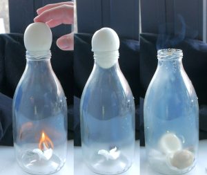 Postup: Do sklenej fľaše hodíme horiaci papier a vajíčko položíme na hrdlo fľaše tak, aby tesnilo. Oheň vytvára vo fľaši podtlak a vtiahne vajíčko do väzenia.