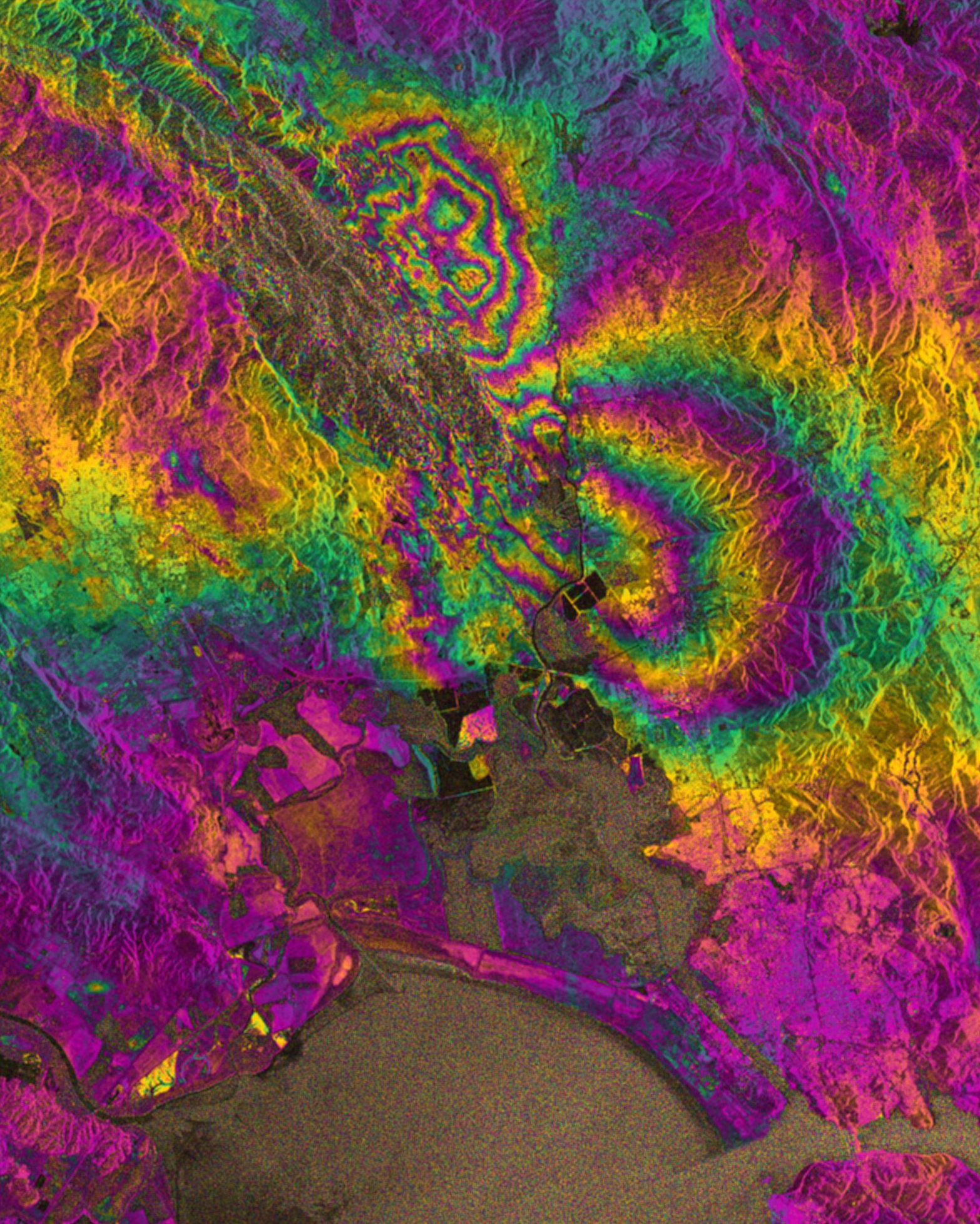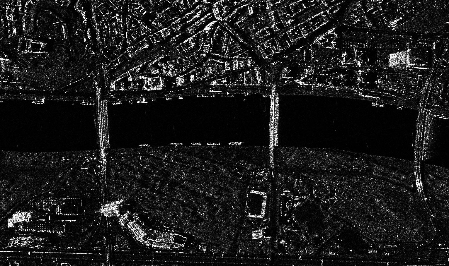 Na snímke intenzity odrazeného radarového signálu z Bratislavy vidíme, že niektoré pixely sú svetlejšie a niektoré, naopak, tmavšie až úplne čierne. Svetlejšie/jasnejšie pixely predstavujú miesta, kde nastal veľmi dobrý odraz signálu a sú to predovšetkým objekty s hranami, kútmi, ako sú skalné steny, zárezy alebo objekty vytvorené ľudskou činnosťou, napríklad budovy, mosty, stožiare a oporné múry. Tmavšie pixely predstavujú miesta, kde došlo k čiastočnému vyrušeniu signálu. Ide hlavne o plochy pokryté vegetáciou, napríklad lúky, kroviny, lesy. Na snímke sa nachádzajú aj veľmi tmavé až úplne čierne pixely. Tie predstavujú miesta, kde došlo k minimálnemu odrazu, prípadne odraz nenastal alebo sa signál odrazil preč od družice ako od zrkadla. Ide najmä o vodné plochy, resp. miesta v zatienení, kde sa signál vôbec nedostal. Vidíme, že technológia InSAR je schopná dobre identifikovať, kde sa na snímke nachádzajú objekty vytvorené ľudskou rukou. Program novej rodiny družíc Sentinel sa začal radarovou misiou Sentinel-1.