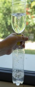 Do vrchnákov v strede urobíme dierky s priemerom 7 – 8 mm. Vrchnáky zlepíme dokopy izolačnou páskou. Do jednej fľaše napustíme vodu a druhú necháme prázdnu. Fľaše spojíme zlepenými vrchnákmi.