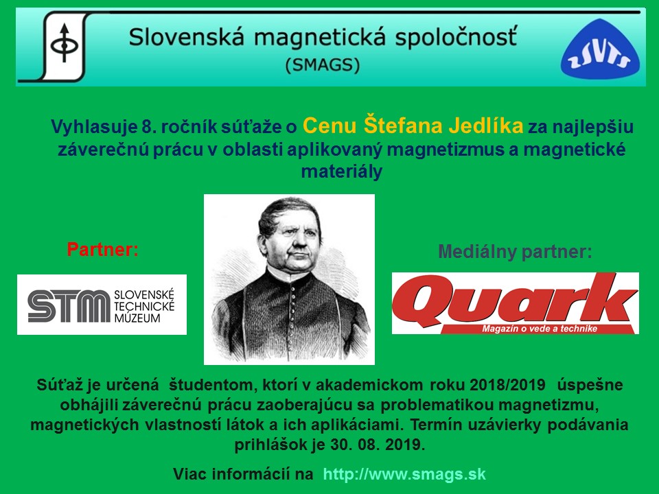 Slovenská magnetická spoločnosť Zväzu slovenských vedeckotechnických spoločností vyhlasuje celoštátnu súťaž o „Cenu Štefana Jedlíka“ za najlepšiu záverečnú prácu v odbore aplikovaný magnetizmus a magnetické materiály. Do súťaže môžu byť prihlásení študenti všetkých univerzít a vysokých škôl SR, ktorí v akademickom roku 2018/2019 úspešne obhájili záverečnú prácu (bakalársku, diplomovú, dizertačnú) zaoberajúcu sa problematikou magnetizmu, magnetických vlastností látok a ich aplikáciami.