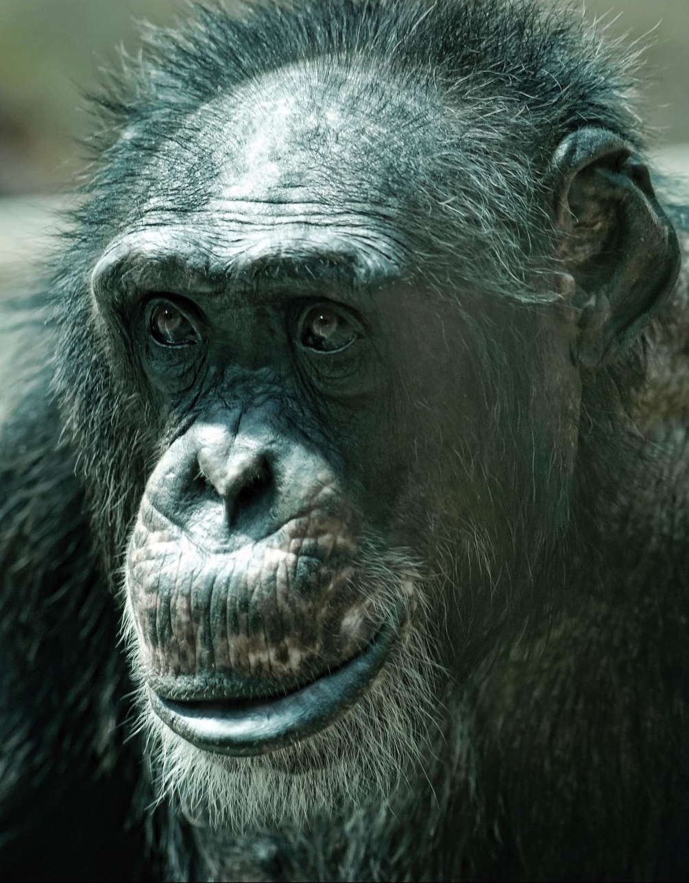 Tvár šimpanza na fotografii