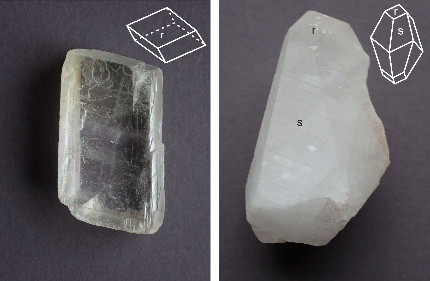 Kryštály kalcitu z lokality Helgustadir na Islande s plochami romboédra (klenca) – r a skalenoédra – s, foto Vratislav Hurai